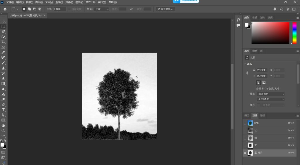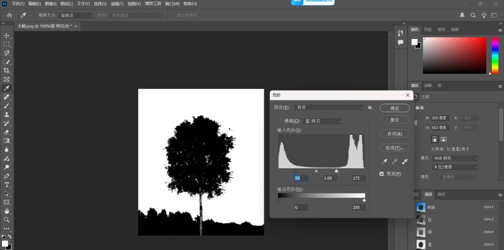 树图片蓝色通道小使用色阶进一步提高黑白对比度