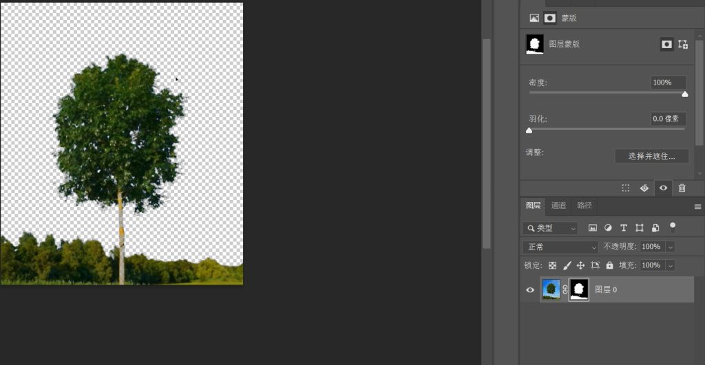 然后切换回RGB,可以看到树的选区已经出来了,会有细微辨认不到位的需要自己手动去除,比如叶子、枝干会有细微辨认错误的,这一部分手动细微调整。