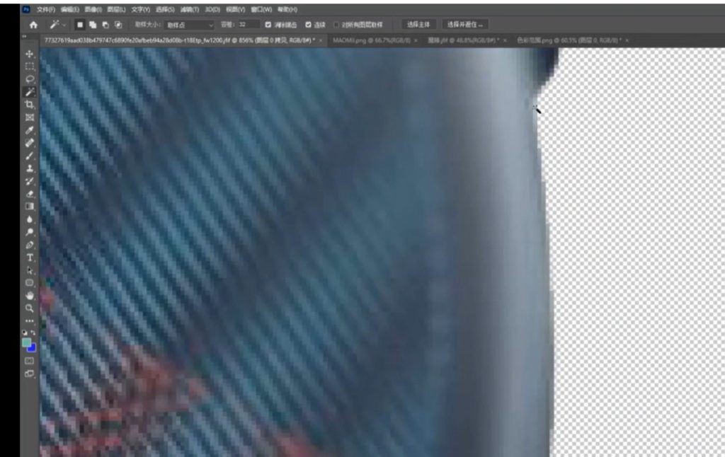 注:边缘光滑锐利这个要注意,因为如果边缘不光滑锐利,比如头发丝,又或者放大看边缘有羽化的效果,这时候用魔棒是会有点瑕疵的,因为魔棒选取的色彩范围差(就是魔棒工具属性栏的色差要你填的值)在抠这类图时不好控制。