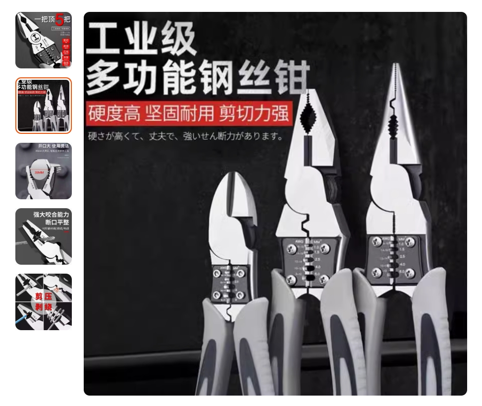 这里,副图展示了这个产品的3个规格产品,强大咬合力,和全能的工作作用,都是消费者潜在的需求点。由于主图的公共共识是展现核心卖点,所以,其他潜在需求点需要副图来进行体现,以满足消费者
