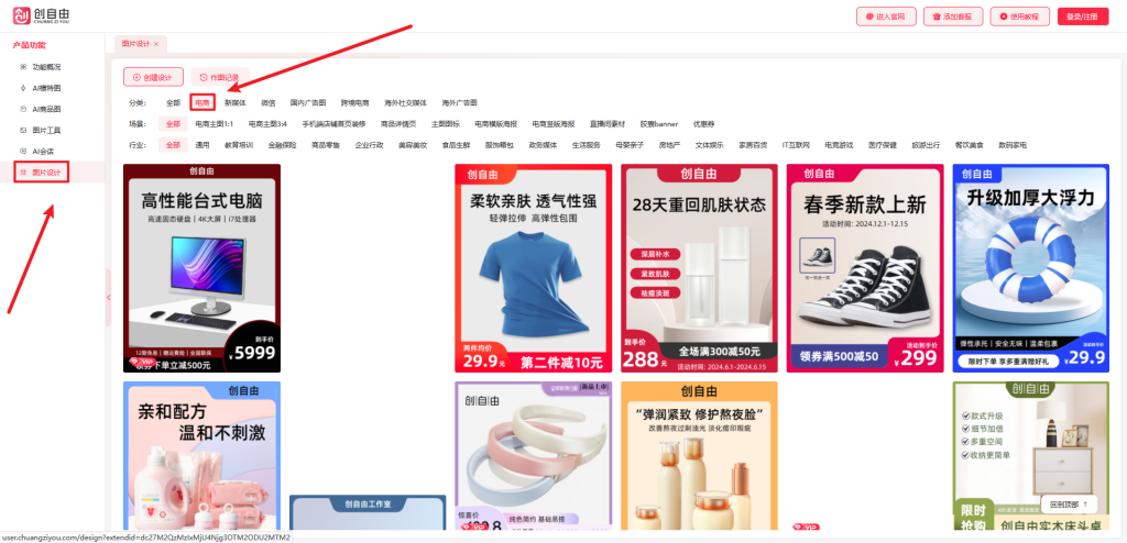 我们今天要说的就是科链矩阵AI,它有一个可以帮助我们完成这方面想法的功能,名为AI图片设计,它的里面就有很多关于电商商品图的素材。我们只需要登录到科链矩阵AI的后台,点击图片设计栏目,就可以很轻松的看到电商商品图模板的页面。