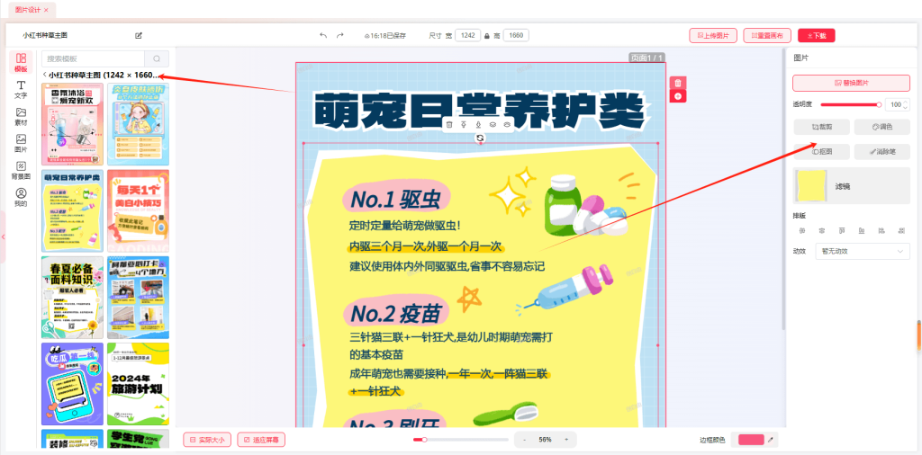 对于设计小红书种草主图,可以直接套用科链矩阵图片设计工具的种草主图模板,直接在线修改图片,根据自己的需求选择合适的素材模板,一键修改、抠图、裁剪等,一键成图。
