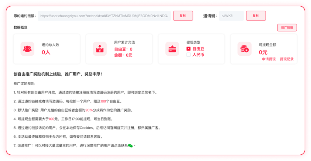 开始推广,每拉新一位新用户,获得100个自由豆,永久 20%推广分成