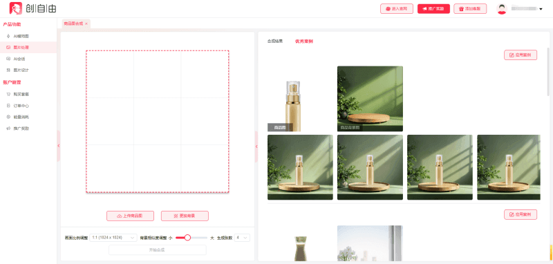 支持一键换背景,提供多种推荐背景和自定义背景选项。自动对商品抠图,并与新背景融合生成完整的宣传图片。支持生成多种常用图片尺寸,一次最多生成4张图片,会员用户可同时生成多组图片。
